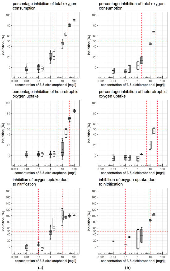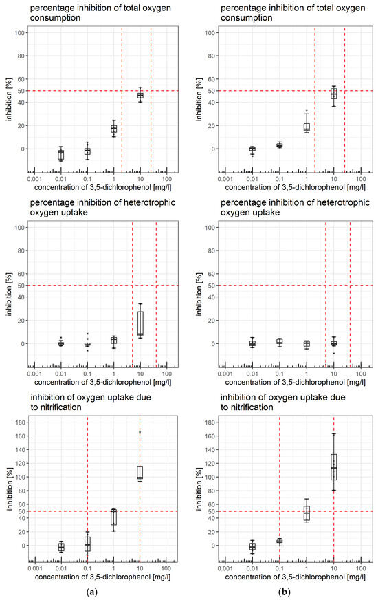 In an alternative approach to the conventional preparation of activated sludge via centrifugation, the potential of settling was investigated. The results were compared using differently prepared activated sludges. Figure 5 shows the inhibition curves obtained with the two differently prepared activated sludges; in particular, (a) the inhibition curves of total oxygen consumption, heterotrophic oxygen consumption, and nitrification inhibition using centrifuged activated sludge, and (b) the same inhibition curves using settled activated sludge are qualitatively shown. The corresponding quantitative results are presented in Table 10. The comparison of the results indicates that there are similar values between the measurements with centrifuged activated sludge and settled activated sludge. Therefore, for verification, the activated sludge was prepared using settling. In both variants, there was always a high linearity (R2 = 0.999). The inhibition of total oxygen consumption, with EC50 values of 9.22 ± 0.21 mg/L and 9.42 ± 0.16 mg/L, respectively, falls within the range of validity (2–25 mg/L, according to ISO 8192 [44]). The inhibition of heterotrophic oxygen consumption could not be determined for both variants; for this, additional test mixtures with higher concentrations of 3,5-dichlorophenol would have been required. The EC50 values of nitrification inhibition of 1.92 ± 1.24 mg/L and 2.17 ± 1.5 mg/L for both variants were also within the range of validity (0.1–10 mg/L, according to ISO 8192 [44]). The optimization results demonstrate that the preparation of activated sludge via settling yields outcomes that are comparable with those achieved using a centrifuge.