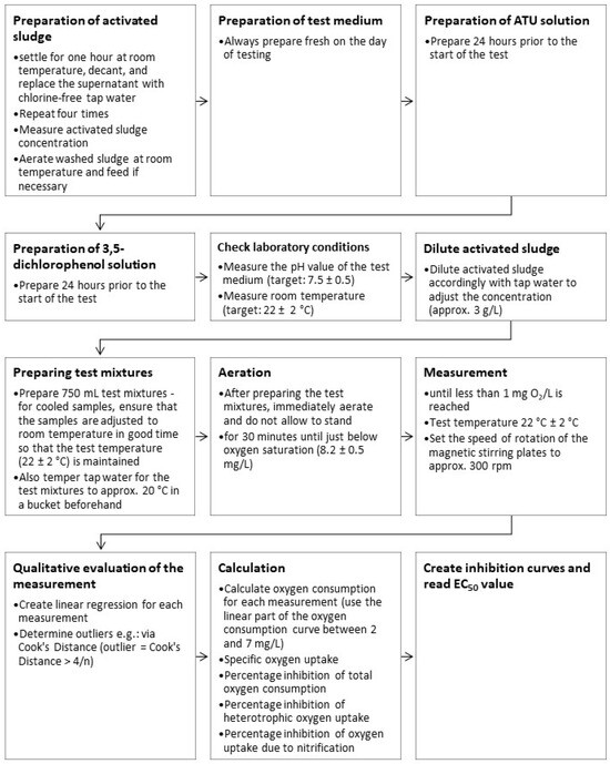 Based on the results of the evaluation and optimization, and the specifications of ISO 8192 [44], a process flow was developed for conducting verification tests under the following conditions: constant stirring speed of the magnetic stirrer at approximately 300 rpm, temperature of the test environment and the test mixture at 22 ± 2 °C, oxygen concentration of the test mixtures during aeration up to 8.2 ± 0.5 mg/L, immediate aeration of the prepared test mixture, preparation of 3,5-dichlorophenol and ATU 24 h in advance, fresh preparation of the test medium (synthetic sewage feed) on the day of measurement, and the use of settled activated sludge. Figure 6 describes the process flow, with its individual steps, based on the evaluation and optimization results.