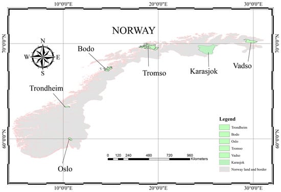 The study encompasses six diverse regions across Norway, each characterized by distinct geographical and climatic conditions that influence their drought forecasting needs (Figure 2). These regions include Oslo, Tromsø, Vadsø, Trondheim, Bodø, and Karasjok, spanning from the southern lowlands to the northernmost points of the country. Norway’s climate is predominantly maritime, strongly influenced by its latitude and extensive coastline, with the Gulf Stream bringing milder air to its shores. Oslo, the capital, experiences a humid continental climate, with relatively warm summers and cold winters, making it critical to evaluate drought impacts on both urban and surrounding agricultural areas. Moving north to Tromsø and Vadsø, the climate shifts to subarctic, where winters are longer and harsher, and summers are milder and shorter, shaping the seasonal dynamics of drought risk. Trondheim and Bodø, with their proximity to the sea, experience a more temperate oceanic climate, which can lead to varied precipitation patterns and influence drought frequency and severity. Karasjok, in the far north, lies well within the Arctic Circle and constitutes an entirely different climate regime, characterized by very cold winters and brief, mild summers, posing specific challenges for drought forecasting. By examining these varied regions, the study aims to encapsulate the wide array of climate conditions present in Norway (Table 1), ensuring that the drought prediction methods evaluated can be adapted to the diverse environmental circumstances found throughout the country.