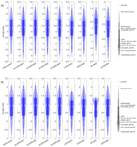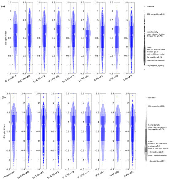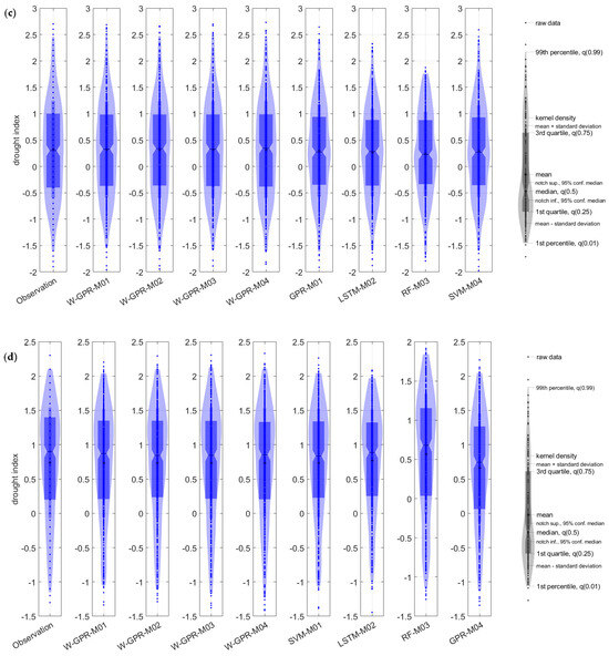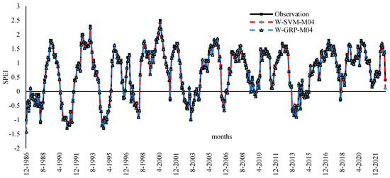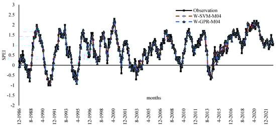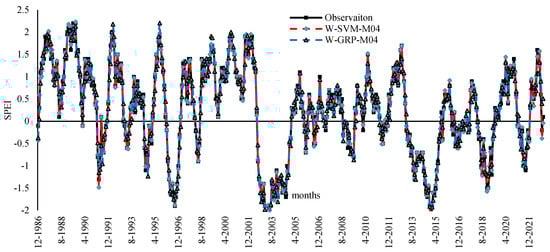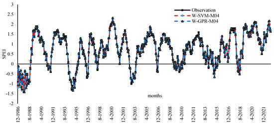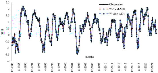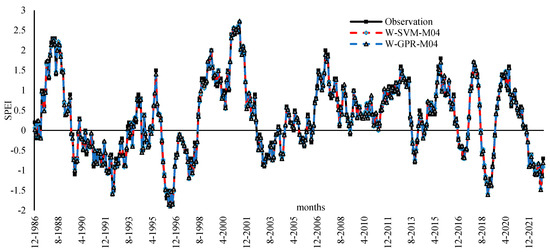 Figure 5 visually illustrates the difference in performances between observed and predicted model drought values achieved by the best two models, W-SVM-M04 and W-GPR-M04, in time series analysis. Overall, no difference was observed and a remarkable agreement revealed between observed and predicted values. Both prediction models provide a good representation of the peak points and demonstrate the ability to accurately capture the drought in the region.
