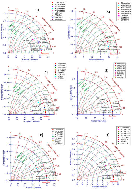 Moving on to the Karasjok region, the performance metrics exhibit slightly better results compared to those obtained in Bodø. Similar to Bodø, the most impressive performance results were obtained in M04 by utilizing W-GPR, with r: 0.9981, NSE: 0.9962, and RMSE: 0.0509. This model is followed by W-SVM in M04 in terms of performance, which achieved r: 0.9979, NSE: 0.9957, and RMSE: 0.0542, demonstrating a close performance to W-GPR. Although the performance values of W-GPR and W-SVM are very close to each other, as in Bodø, W-GPR represent slightly better results compared to W-SVM in this region. It can be concluded that both W-GPR and W-SVM consistently deliver the most effective prediction results. M02 further supports the above conclusion, with identical performance metrics in W-SVM M02 and W-GPR M02, with r: 0.9946, NSE: 0.9892, and RMSE: 0.0866. In M01 and M03 models, the most effective results were obtained with W-GPR; however, these performance values were lower than that determined in M04. The findings obtained from the analyses conducted for Karasjok indicate that the highest performance values were achieved using W-GPR in M04 and the performance metrics of all algorithms improved after WT, aside from RF, which showed a decrease. Prior to WT, analyses revealed that the most desirable results for this region were observed in M01 using SVM, with r: 0.9433, NSE: 0.8850, and RMSE: 0.2820.