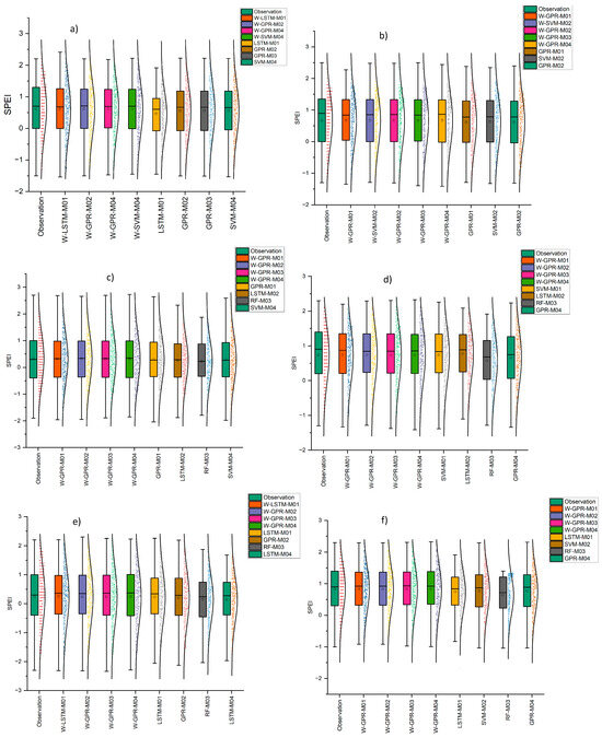 This study employed the SPEI12 index to forecast future droughts as it effectively captures meteorological drought conditions [95]. Numerous researchers also consistently utilized SPEI12 for drought monitoring and prediction [16,63,96,97,98,99]. Four different models, for which were determined by cross-correlation of the input data, were analyzed with a series of machine learning methods and deep learning methods, SVM, RF, LSTM, and GPR, for the six different regions. Then, the models’ performance was improved by means of WT. Consequently, the results of the analyses performed with the different models and algorithms are shown based on stations in Table 3. Table 3 serves the analysis results of all models using several machine learning techniques, including SVM and RF, as well as deep learning algorithms such as LSTM and GPR. The models that achieved the best results within their respective groups are indicated in bold. Additionally, all reviews in Table 3 were assessed individually for each station.