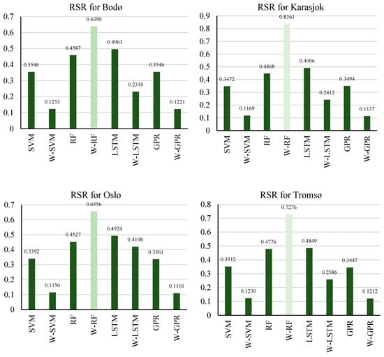 In addition to above metrics, a more robust comparative performance analyses were also demonstrated by using an RMSE-standard deviation ratio (RSR), as defined in Equation (17) [94].