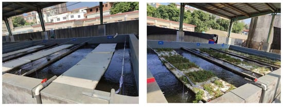 The simulated grouper aquaculture experiment was carried out at the Dajing Base of the Fujian Research Centre for Marine Aquaculture. As shown in Figure 1, the experimental aquaculture site consists of six artificially constructed cement aquaculture experimental ponds (6.5 m long, 2.9 m wide, and 1.2 m deep) arranged side-by-side under a shed with ventilation on all sides. One day prior to the experiment, seawater was extracted from the adjacent sea area, filtered through a sand filter, and then pumped into the experimental ponds until the depth of the water reached 1 m. The salinity of the seawater was 32.6 and the concentration of dissolved oxygen (DO) was 7.10 mg/L.