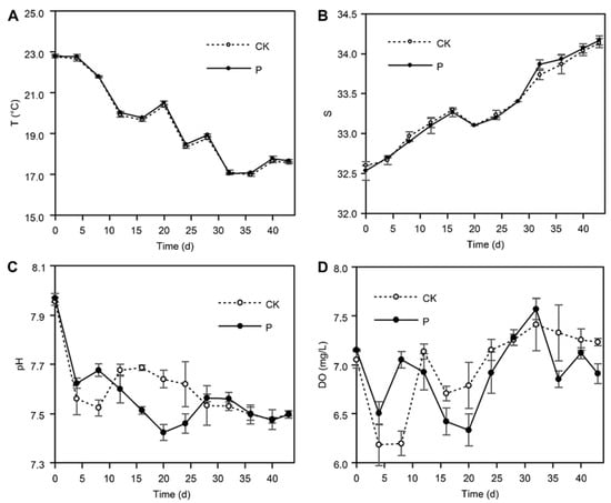 Average changes in the temperature (T), salinity (S), pH, and dissolved oxygen (DO) of the water in the aquaculture ponds (CK: control group; P: plant group). (A) Temperature (B) Sanility (C) pH (D) Dissolved oxygen.