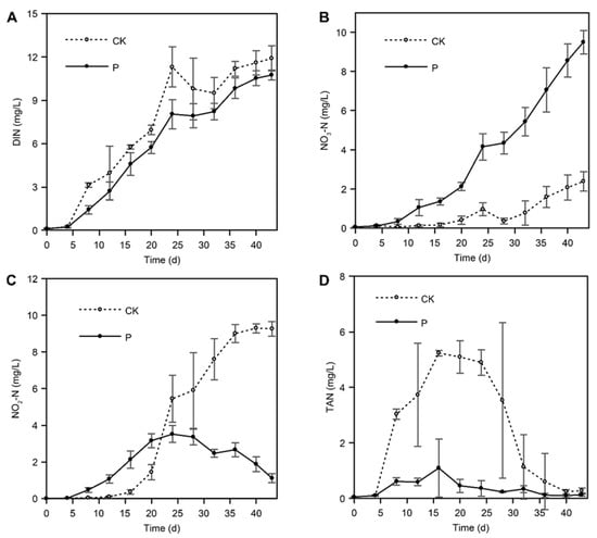 Changes in the dissolved inorganic nitrogen concentration and composition of the aquaculture water (DIN: dissolved inorganic nitrogen; NO3-N: nitrogen in the form of nitrate; NO2-N: nitrogen in the form of nitrite; TAN: total ammonia nitrogen; P: plant group; and CK: control group). (A) DIN (B) NO2−-N (C) NO3−-N (D) TAN.