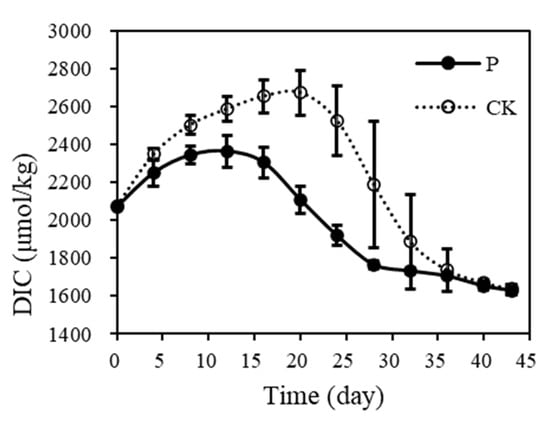 Changes in DIC content in aquaculture water (DIC: dissolved inorganic carbon; P: plant group; and CK: control group).