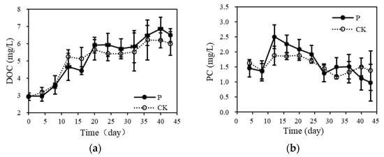 The average changes in the (a) DOC (dissolved organic carbon) and (b) PC (particulate carbon) in the water.