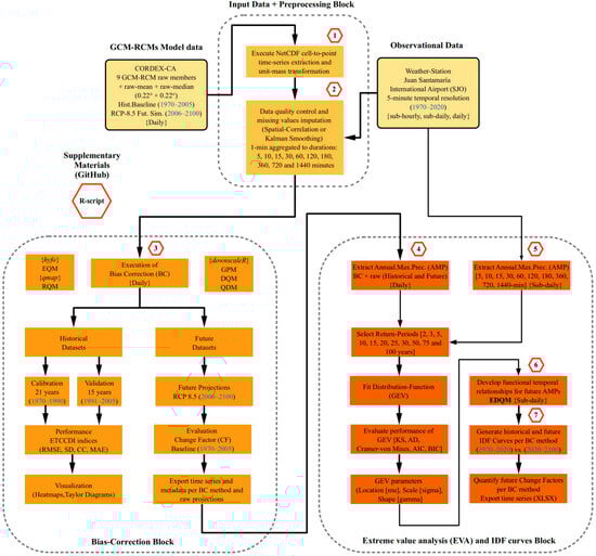 Mendez, M.; Calvo-Valverde, L.-A.; Hidalgo-Madriz, J.-A.; Araya-Obando, J.-A. Assessing the Effect of Bias Correction Methods on the Development of Intensity–Duration–Frequency Curves Based on Projections from the CORDEX Central America GCM-RCM Multimodel-Ensemble. Water 2024, 16, 3473. https://doi.org/10.3390/w16233473