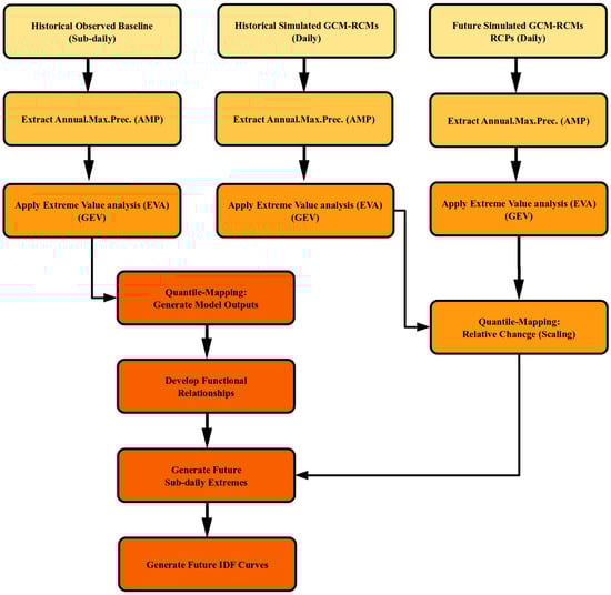 - Use the relationship equation derived in step 6 to obtain the future maximum sub-daily time series;