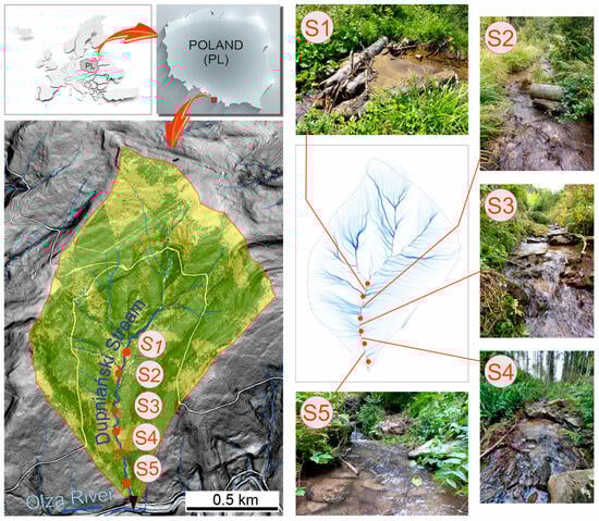 The Dupniański stream catchment area in the Silesian Beskids Mts in the Polish Carpathians with five sections of the stream channel (from S1 to S5).