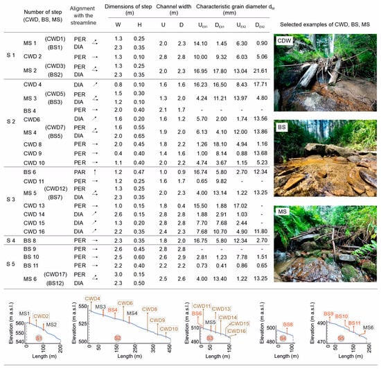 Coarse woody debris (CWD), boulder step (BS), and mixed structure (MS) dimensions (in m): W—width; H—height. Alignment with the streamline: DIA—diagonally; PER—perpendicular; PAR—parallel. Channel width: U—upstream of step; D—downstream the step. Characteristic grain diameter (d50) for sediments sampled from coarse woody debris (CWD), boulder steps (BSs), and mixed structures (MSs) during EX1 (summer) and EX2 (autumn) periods, upstream (U) and downstream (D) of the step. S1–S5—five sections of the stream channel.
