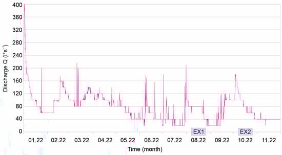 In order to characterize the water discharge (Q) in the stream during EX1 and EX2 (Figure 3), data recorded with the limnigraph installed in the closing profile on the fifth S5 at the damming stage with a two-part overflow, i.e., with a triangular shape (in the lower part) and a trapezoidal shape (in the upper part), were used. Daily water levels were recorded with an assumed time interval of 10 min. The flow curve, according to which the water levels were converted into discharge (Q), was plotted on the basis of direct measurements made with a calibrated vessel. All recorded water levels in a given month in 2022 were within the lower triangular part of the overflow (Thomson type), where the angle at the apex at the lowest part of the overflow is 90° and the height is 0.6 m.