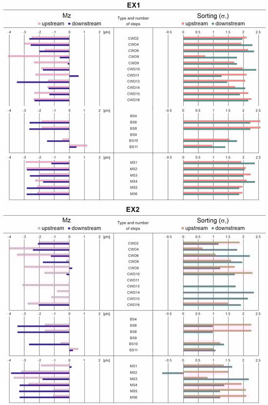 Sediments deposited upstream and downstream of BSs are characterized by varying degrees of sorting: from very weak (σ1: 2.24) to moderate (σ1: 0.95–0.97). A comparison of degrees of sorting of sediments deposited downstream and upstream of BS in EX1 and EX2 shows that only in one sample did the degree of sorting fall from moderate to very weak and in the remaining samples, the degree of sediment sorting did not change. Similarly to the CWD thresholds, the grain-size distribution is usually highly positively skewed (Sk: 0.37) or symmetrical (Sk: from −0.01 to +0.08).