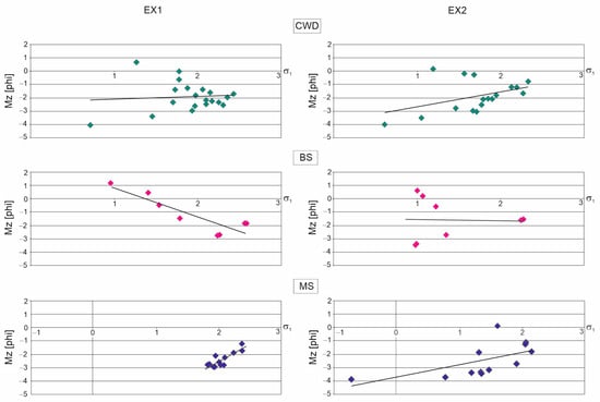 Deposits accumulated on MSs, in comparison to samples collected from these thresholds in EX1, exhibit greater variation in sorting degree (from very poorly sorted to very well sorted), with σ1 values ranging from −0.70 to 2.16. These threshold deposits generally display a highly positively skewed grain-size distribution (Sk: from +0.31 to +1.40) relative to the most frequent grain-size fraction. As the average grain diameter decreases, the degree of sediment sorting also decreases (Figure 6). This is a characteristic feature of sedimentation environments, which reveal the dominance of sorting processes (trough–bedload deposits).