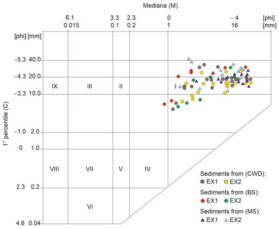 The description of the sediment grain size required performing granulometric composition analysis. The granulometric composition of the mineral material was determined by sieve analysis, according to EN 933-1:2012 [], which revealed the grain diversity of the Istebna sandstones in the catchment. This resulted in selecting particles of fine-grained (A) and coarse-grained (B) sandstone gravel in each of the samples. The location of the samples was determined in the C/M diagram (C—first percentile; M—median) []. The two characteristics, grain size diversification and granulometric indicator values, were considered separately for sediments sampled in CWD, BSs, and MSs, and for each of the two study periods: EX1 and EX2. The following granulometric indicators were calculated, according to Folk and Ward []: diameter (d50), mean grain diameter (Mz in phi scale), skewness (Sk), kurtosis (Kg), and standard deviation (σ1) (sorting). The granulometric analysis software (GRADISTAT v. 4.0) [] was applied for calculations.