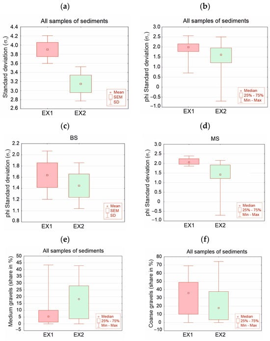 The results indicate clear differences between sediments associated with CWD, BSs, and MSs, documenting significant variability in the granulometric composition of deposits upstream and downstream of various types of steps in the longitudinal profile of the stream channel. This differentiation is particularly noticeable in CWD and MSs. A slight differentiation in hydrodynamic conditions between EX1 and EX2 allows for concluding that the variability of the textural features of sediments is determined by the threshold type, which is supported by the results of the statistical analysis (Figure 7, Figure 8a–d).
