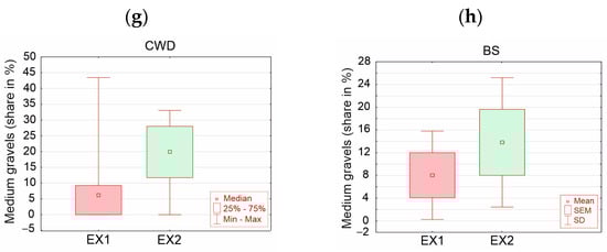 Differences between mean values of degree of sorting (standard deviation σ1) for all samples of sediments (a,b) and for sediments fraction accumulated on boulder steps (BSs) (c) and on mixed structures (MS) (d); during EX1 (summer) and EX2 (autumn) period and mean values of medium and coarse gravels for all samples of sediments (e,f); and for sediment fraction accumulated on coarse woody debris (CWD) (g) and boulder steps (BSs) (h), during EX1 and EX2 periods.