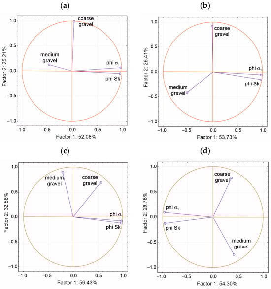 The projection of variables onto the factor plane (PCA), where research duration (EX1 and EX2) is used to categorize variables, indicates no relationship between experiment duration and sediment parameters (Figure 8a–d). Similarly, an evaluation of grouping variables such as sediment deposition location (upstream or downstream of the steps), step type (CWD, BS, or MS), and its position in the longitudinal profile (sections from S1 to S5) revealed no significant influence on sediment characteristics. Therefore, the first two components are explained by the conditions of transport and deposition of materials. Granulometric indices phi σ1 and phi Sk negatively influence the first factor component, which explains over 53% of the distribution variability. Indices phi Sk and phi σ1 and medium gravels significantly affect the primary component of the first factor, but in opposite directions. The step type modifies the relationships between sediment parameters and the diameter of transported gravels. When considering all step types (CWD, BSs, and MSs) (Figure 8a), the first factor explains over 52% of the variability and is characterized by a negative correlation between medium gravels and skewness (phi Sk) and sorting (phi σ1), along with a positive relationship between skewness (phi Sk) and sorting (phi σ1). As grain diameter increases, sorting (phi σ1) decreases, and skewness also decreases. This relationship is not observed for coarse gravels, indicating that the first factor is associated with more frequent transport conditions, distinguishing sediments that are frequently transported and retained at steps from those only mobilized during floods. Therefore, the first factor can be identified as the transport factor of sediments. In the case of coarse woody debris (CWD), the previously observed relationship becomes even more distinct (Figure 8b), and an additional second factor emerges, explaining over 26% of the variability. This factor reflects transport conditions that lead to the homogenization of gravel sizes. This may indicate the dynamic environment of material deposition during floods and the importance of CWD steps in capturing sediments. Boulder steps (BSs) do not differentiate the grain size of deposited material; there is no negative relationship between medium and coarse gravels in the second factor (Figure 8c). Sediments from BSs reveal characteristics that are positively correlated with sorting (phi σ1) and skewness (phi Sk), without any relationship between gravel diameter and sorting. Mixed structures (MSs) behave similarly to CWD during events. For sediments from MSs, the negative correlation between medium and coarse gravels is even more pronounced, with the second factor explaining up to 32% of this sediment characteristic (Figure 8d). It is worth noting that sediment analysis was conducted on samples taken from a geologically uniform mountain stream channel with local undercuts that may influence sediment parameter modifications. The analysis emphasizes the importance of local material supply to transport within the longitudinal profile during high-intensity events.