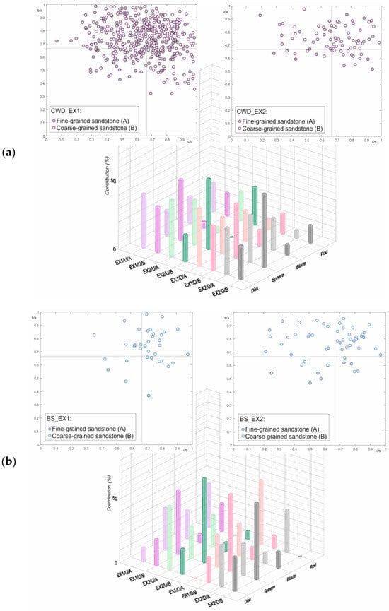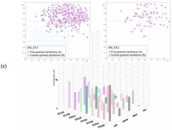 An analysis of gravel shape was performed for a total of 1036 grains, i.e., 818 gravels collected during EX1 and 218 during EX2 (Figure 9a–c). In total, 414 gravels from fine-grained sandstone (A) and 622 from coarse-grained sandstone (B) were sampled. In August (EX1), there was no accumulation of gravels upstream and downstream of BS4 and BS9 and downstream of BS2.