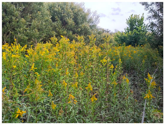 Riparian zones are characterized by high degrees of IAP colonization [4,25], either in terms of frequency [26] or absolute [27] and relative [28] species richness and cover. In restored riparian habitats across Europe, Solidago gigantea (Asteraceae) is a frequently occurring IAPs (Figure 1). It was introduced to Europe around 1758 and became naturalized in the middle of the 19th century [29]. Today, it is distributed across most of Europe, except for the southernmost and northernmost parts [30]. This species, a rhizomatous perennial herb and member of the North American goldenrod species complex, is highly invasive in Europe [31] and widespread in various ecosystems [31]. It occurs abundantly, forming dense stands in dry grasslands and steppes but also in riparian habitats and alluvial or humid grasslands [30]. This species easily colonizes disturbed habitats and establishes permanent, high-density populations [32,33], which makes it both a „passenger“ and a „driver“ of ecosystem change [34,35,36,37]. In its introduced range, it largely transforms the physicochemical and biological soil properties [38] and forms dense monospecific stands, thereby disturbing the structure of the local habitat [39]. Given its high competitive ability [40], rapid growth, and polyploidization [41], it displaces native plant communities by decreasing their species richness and diversity. Introduced (European) S. gigantea populations produce a larger number of shoots compared to native (American) populations, which may increase their ability to compete against established species in dense or nutrient-poor stands [42].