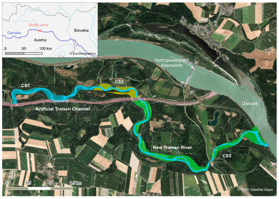 The study area is located along the Danube River in the downstream section of the Traisen River, Lower Austria, in the municipality of Zwentendorf an der Donau. The average elevation is 170 m above sea level. The nearby municipality of Tulln reaches an annual average temperature of 9.6 °C and an annual average precipitation of 616 mm [50]. The Danube River was regulated in the 19th century to reduce flooding and gain land area for agriculture. In 1973, with the construction of the Danube hydroelectric power plant in Altenwörth, the river mouth of the Traisen River was relocated.
