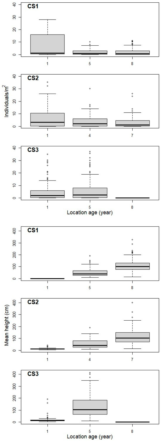 The three construction sections differed in terms of S. gigantea cover (Figure 4), and we investigated the impact of S. gigantea on tree occurrence in more detail. Specifically, using data from the last 2 monitoring years (2018 and 2021), we compared S. gigantea cover with tree species development. Tree species performance was estimated using a combination of change in tree height (cm) and change in tree density (individuals/m2) (Table 2) and subsequently related to the different S. gigantea cover classes.