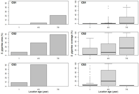Development of Solidago gigantea across all three construction sections (CSs), focusing on habitats with S. gigantea and S. gigantea coverage within these habitats for three investigated site ages. For the location of the CS, see Figure 2.