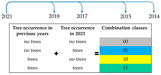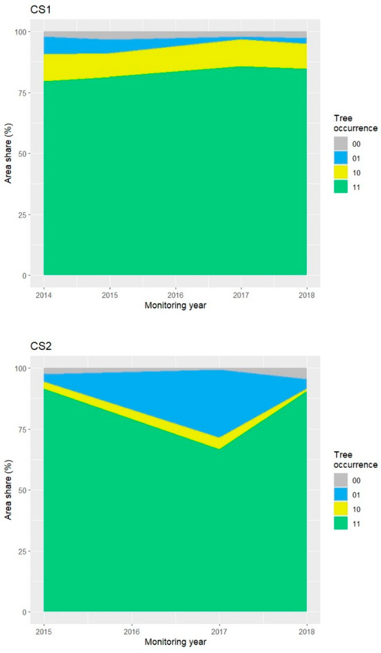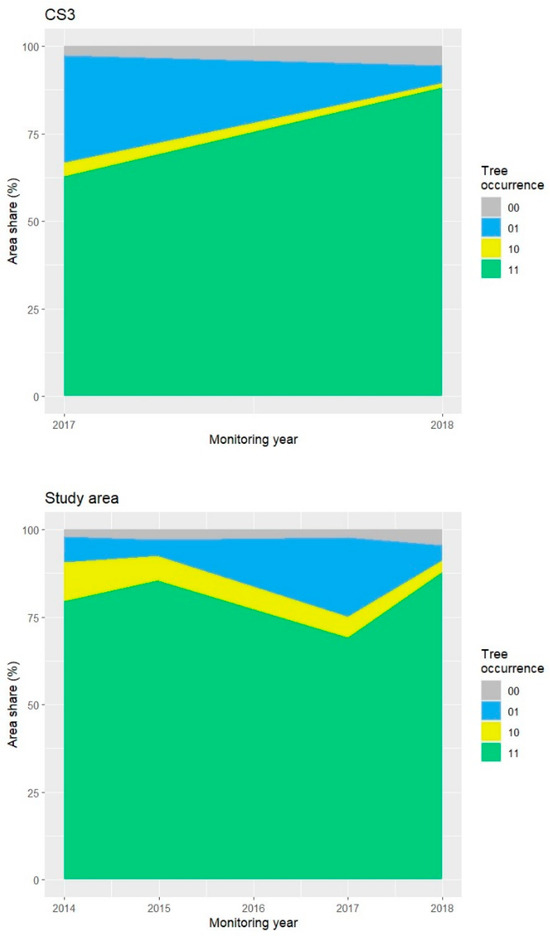 Based on the results, the area with no tree occurrence across all years, compared to that in 2021 or with trees that vanished over the monitoring period, was low. The area without tree occurrence in the previous monitoring years but with tree occurrence in 2021 (combination 01 in Figure 9) occupied an intermediate position but was low and decreased toward the end of the monitoring period. Most of the study area was covered by trees from the beginning until the end of the monitoring period (combination 11 in Figure 9).