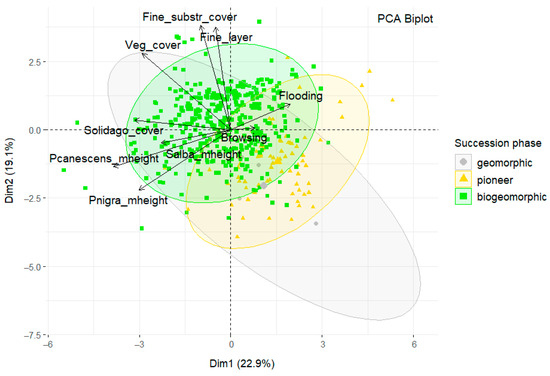PCA using the species height and habitat parameters of the last monitoring year, 2021. For the definition of the succession phases, see Corenblit et al. [54,55].
