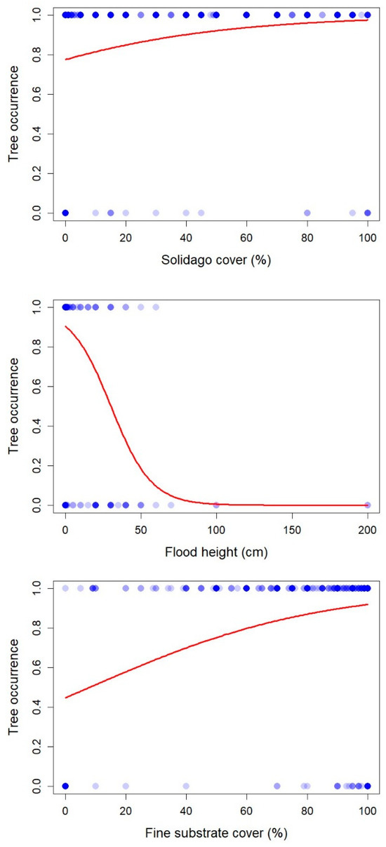 The most relevant habitat parameters influencing tree occurrence in the study area are Solidago gigantea cover, flood height, and fine substrate cover. The red line represents the estimated probability of the tree occurrence as a function of the individual habitat parameter. The blue dots represent individual plots, and the darker color represents a cluster of recording points.