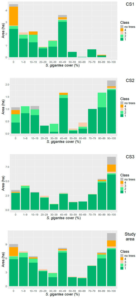 Our observations support the assumption that a high S. gigantea cover can have a negative influence on the development of woody plants. However, in our study, this only applied to sites with an extremely high S. gigantea density. Furthermore, other parameters and processes can also have a negative influence on tree growth, as can be seen from the negative tree development despite low S. gigantea cover.