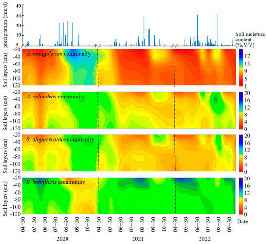 Spatiotemporal dynamics of soil moisture in the four plant communities.