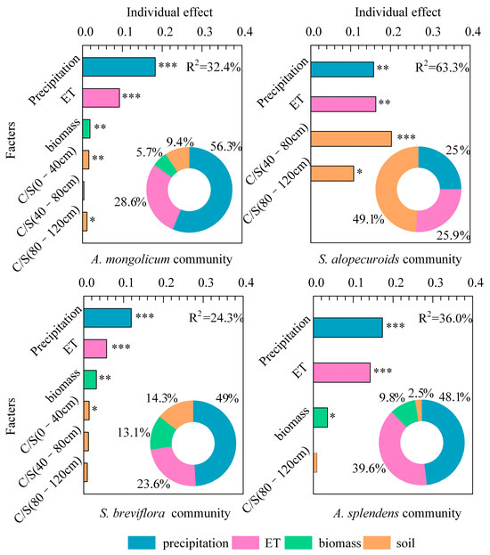 The individual effects and proportions of factors affecting soil moisture dynamics in the four plant communities based on hierarchical segmentation. ET represents evapotranspiration (mm), and C/S is the ratio of soil clay to sand content (clay/sand). (The significance level is α = 0.05, with “***” representing p ≤ 0.001, “**” representing p ≤ 0.01, “*” representing p ≤ 0.05.
