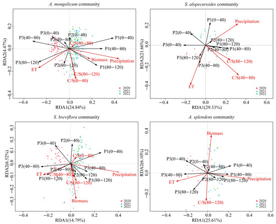 Redundancy analysis (RDA) depicting the relationship between soil moisture content in different periods and precipitation, evapotranspiration, C/S of each community, and above-ground vegetation biomass of each community. The black arrows represent the response variables (%, V/V), while the red arrows indicate the explanatory variables. ET stands for evapotranspiration (mm), and C/S is the ratio of soil clay to sand content (clay/sand). P1 corresponds to the soil moisture depletion period, P2 corresponds to the soil moisture recovery period, and P3 corresponds to the soil moisture stability period.