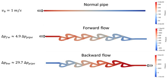 To understand the baseline behavior of Tesla valves, Figure 5 illustrates the normal flow in a Tesla valve, showcasing fluid movement in both the backward and forward directions. The fixed geometry of the Tesla valve creates a preferential direction of flow, allowing fluid to traverse with minimal resistance in one direction and acting as a nearly impenetrable barrier in the opposite direction. This inherent design is essential for comprehending the subsequent analyses of transient events within the Tesla valve.