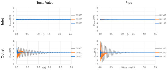 Figure 8 depicts the transient response (pressure over time) for Tesla valves versus normal pipes in a 5 s simulation. This temporal analysis aims to reveal the dynamics of pressure fluctuations during transient events and how Tesla valves effectively mitigate the impact over time.