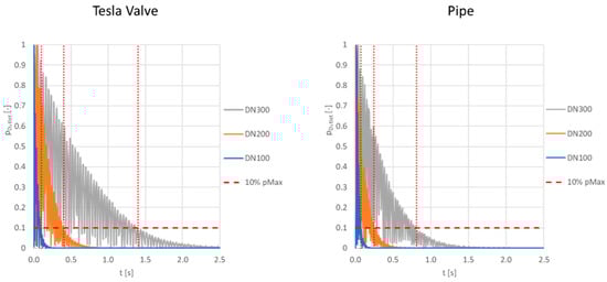 Figure 6 presents detailed transient wave simulations for Tesla valves and a conventional pipe for diameters of 100 mm, 200 mm, and 300 mm. These simulations aim to showcase the capability of Tesla valves in reducing wave amplitudes and extending their duration during transient flow events. The results provide crucial insights into how the geometry of Tesla valves influences the transient behavior of fluid within the system.