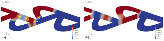 The projected trajectory for the pressure fronts from high to low pressure. (a) illustrate the pressure pockets at 0.01049 s, while (b) shows the pressures a 0.16 millisecond after.