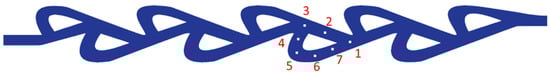 Measurement points in the third lower chamber of the Tesla valve. The numbering (1–7) indicates specific locations used in the CFD simulation to extract detailed flow and pressure data for analysis.