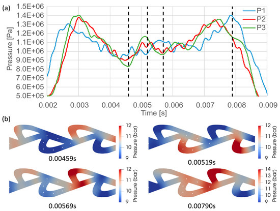 Figure A1 and Figure A2 illustrate the measured pressures and velocities at the seven points over 5 s, with a time step of . To illustrate the non-uniform propagation of pressure fronts within the Tesla valve, pressure readings at points 1, 3, and 5 are analyzed. These points were selected as they represent the behavior at the corners of the chamber. Figure 12 presents the pressure plots, with dashed lines indicating the timestamps corresponding to the accompanying snapshots.