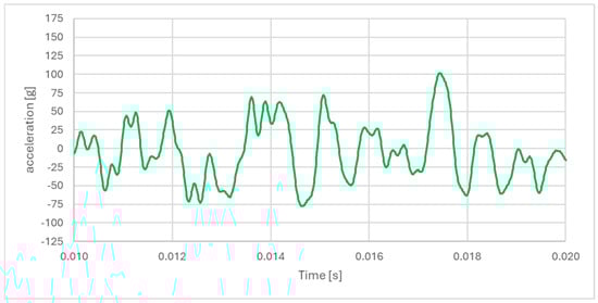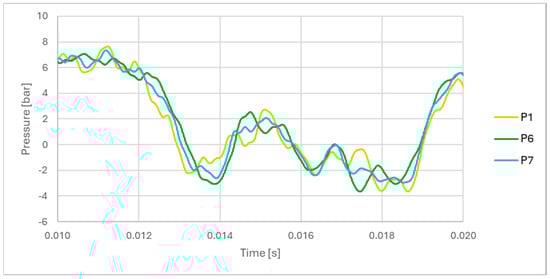 As seen in Figure 13, the pressure amplitudes at points 1 and 6 exhibit a temporal phase shift. This temporal misalignment manifests that the peak pressure amplitude at point 1 coincides with the nadir of pressure at point 6. Conversely, the peak pressure amplitude at point 6 aligns with the nadir of pressure at point 1. This phase shift indicates a temporal disparity in the oscillatory behavior of pressure fluctuations between the two points. The pressure at point 7 falls intermediary to the extremities represented by the pressure amplitudes at points 1 and 6. The temporal phase shift observed between points 1 and 6 exerts dynamic forces that influence the flow dynamics at point 7. Notably, between the time interval of 0.017 to 0.018 s, this influence results in a discernible acceleration observed at point 7, as can be seen in Figure 14.