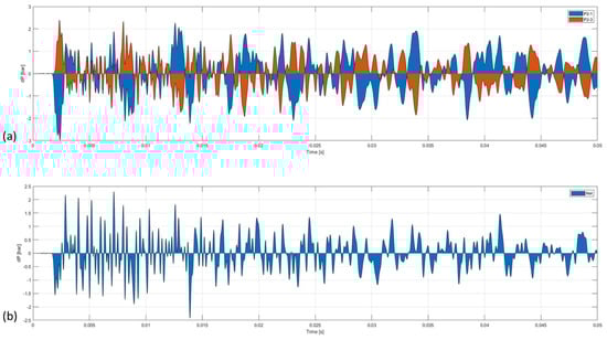 Figure 15a presents the pressure differentials between points 2–1 and 2–3, while Figure 15b presents the resultant net pressure at point 2. The upper plot reveals a distinct asymmetry: when the pressure difference between points 2 and 1 is positive, the pressure difference between points 2 and 3 becomes negative and vice versa. This counteracting behavior leads to a reduction in the overall pressure gradient at point 2. This phenomenon underscores the impact of the Tesla valve’s geometry on pressure wave propagation, where opposing pressure forces diminish each other, rather than creating a uniform pressure front.