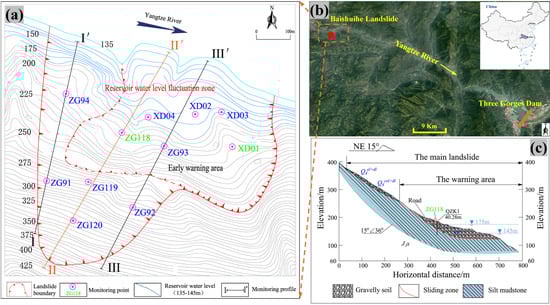 The Baishuihe landslide is situated on the southern bank of the Yangtze River (Figure 2b). The landslide exhibits a fan-shaped geometry, with its front edge below the 135 m water level, and its back edge situated at approximately 410 m a.s.l (Figure 2a). The geological profile, as depicted in Figure 2c, reveals that the sliding mass primarily consists of Quaternary sediments with a disorganized internal structure. The underlying bedrock is composed predominantly of Jurassic siltstone, quartz sandstone, and arenaceous shale. Geological investigations have identified two potential slip zones within the landslide. The shallow sliding zone, occurring at depths of 12 m to 25 m, is separated from the deeper sliding zone, which lies at the boundary between the underlying carbonaceous mudstone and the basal cataclastic rock.