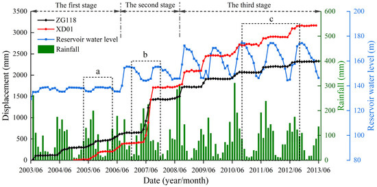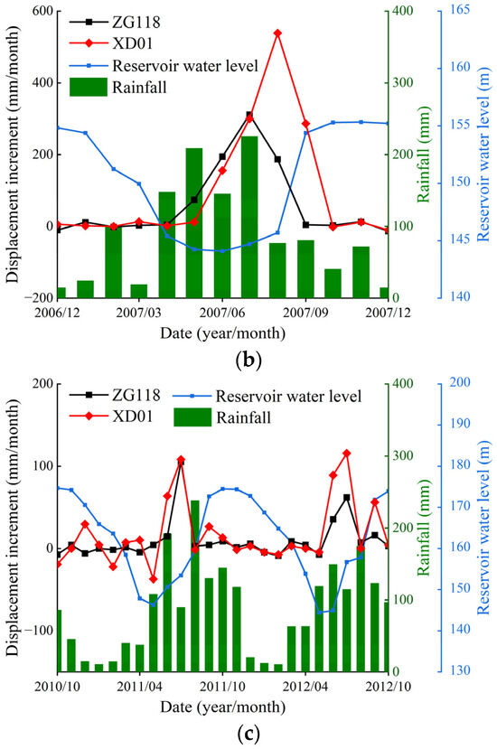 Stage 1: from June 2003 to August 2006. Prior to the initial operation of the TGR, displacement occurred more gradually, exhibiting a strong correlation with seasonal rainfall. The landslide experienced rapid deformation annually, typically from April to September, and remained relatively stable from October to the following April. As shown in Figure 4a, from April 2005 to April 2006, the RWL remained relatively stable, and the deformation increments did not exhibit significant fluctuations in response to RWL changes. However, following peak rainfall in August 2005, the displacement increments at the ZG118 and XD01 sites reached maximum values in September and October, respectively. It indicates that rainfall had a certain impact on deformation with a noticeable lag effect.