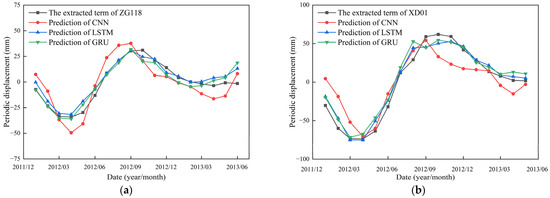 Comparison of measured and predicted periodic displacement during the testing period. (a) ZG118; (b) XD01.