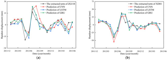 Comparison of measured and predicted random displacement during the testing period. (a) ZG118; (b) XD01.