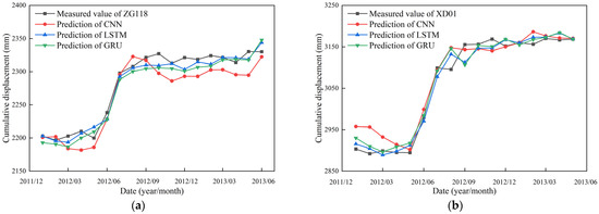 Comparison of the measured and predicted cumulative displacement of individual models. (a) ZG118; (b) XD01.