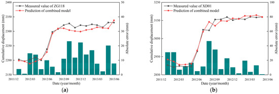 Comparison of the measured and predicted cumulative displacement of combined model. (a) ZG118; (b) XD01.