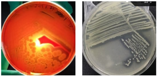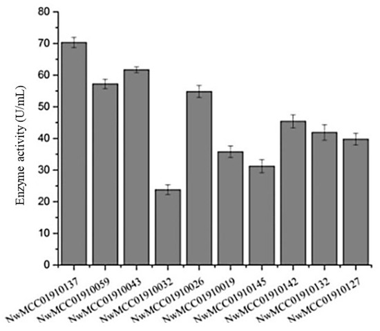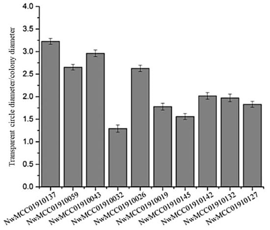 The primary screening plate with casein as the only nitrogen source was diluted, coated with the sample-enriched bacterial solution, and cultured at constant temperature. Microbial colonies with differently sized degradation circles grew on the casein selection medium. Fifty colonies with faster growth and larger degradation circles were chosen, and each one was selected and streaked on a blood plate. After being cultured at 37 °C for 15 h, 10 colonies with large degradation circles were chosen and streaked on the blood plate several times. The process of separation continued until a pure culture single colony was isolated. Once the single colony was purified, glycerol was used to store the colony at −80 °C. Figure 1 shows the ratio of the diameter of the transparent circle to the diameter of the colony of the top 10 strains. The isolate NwMCC01910137 had the highest ratio of 3.2, and the isolate NwMCC01910032 had the lowest ratio of 1.3. Figure 2 shows the transparent circle of the isolated NwMCC01910137 on the blood plate and the casein plate. The higher ratio of the transparent circle to the colony’s diameter indicates higher tolerance/resistance to the selected compound [34]. Figure 3 displays the re-screening results. The strain NwMCC01910137 exhibited the highest enzyme activity and served as a candidate for subsequent experiments.